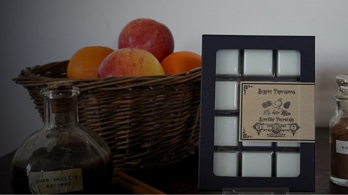 Hello and welcome to Bercot Provisions. Explore our unique assortment of candles and wax melts. Our candles feature wood wicks, while both candles and wax melts have been meticulously crafted using coconut wax, beeswax and one-of-a-kind scents. Each of our candles and wax melts are created to fill your space with inviting cozy scents with a nostalgic feeling.
